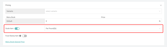 - Pricing: You can adjust your prices based on variant groups and menu books. You can also note if this is a Scale Item.